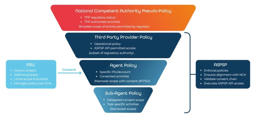 Agentic consent models must therefore bridge the gap between the regulatory pseudo-policy defined by the national competent authority and the executable consent policies enforced by the ASPSP’s authorisation infrastructure.
