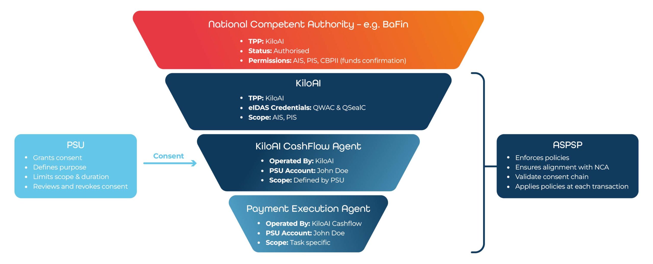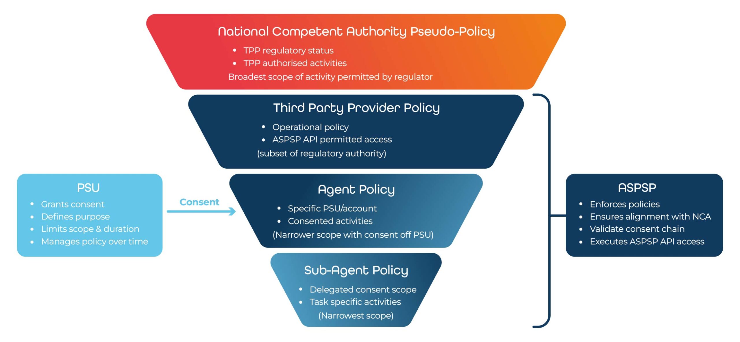 As shown in the diagram, authority narrows at each layer, from regulatory permission through to task-specific execution, while remaining enforceable by the ASPSP.