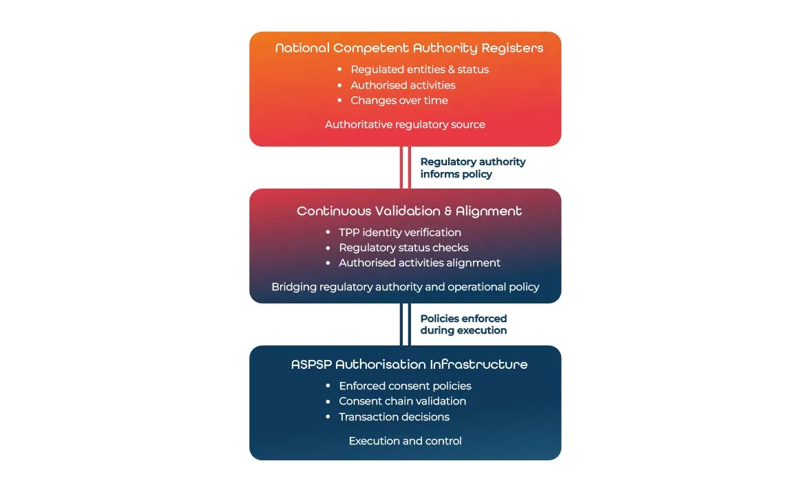 This makes continuous validation essential. ASPSPs must be able to bridge the gap between regulatory pseudo-policies defined by national competent authority registers and the operational policies enforced by their authorisation infrastructure.