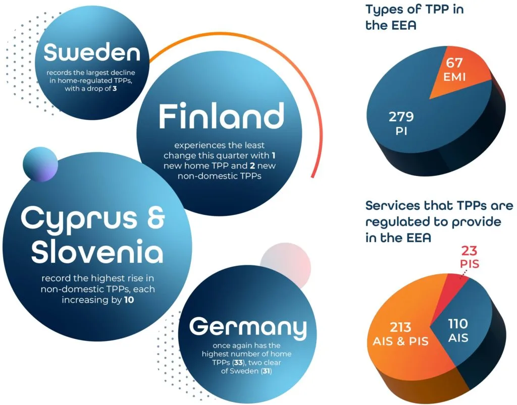 - Conversely, ten TPPs lost open banking permissions across seven EEA countries: Bulgaria (1), Cyprus (1), Estonia (2), France (1), Germany (1), Poland (1) and Sweden (3).